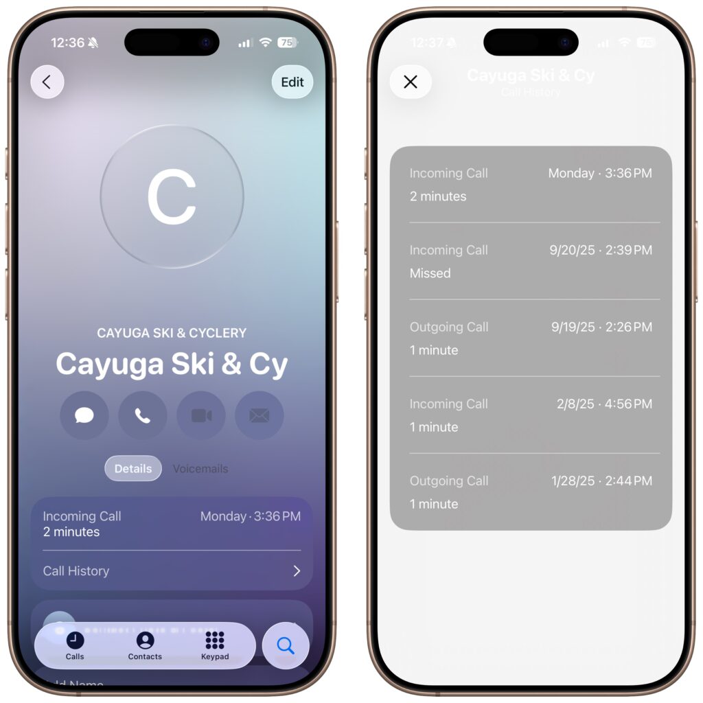 Open a contact in the Phone app, and you’ll see Call History for that person—often going back years. It’s useful for tracking when you last spoke.
