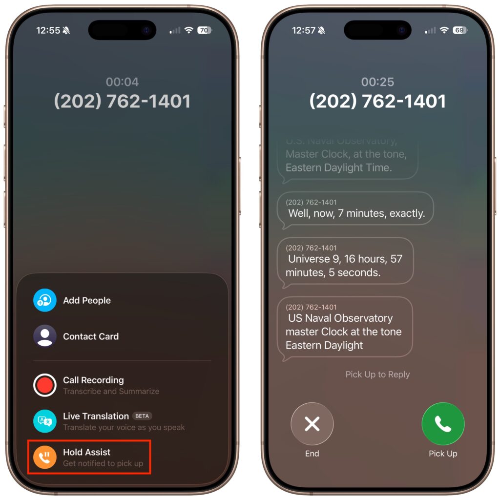 When a company puts you on hold, Hold Assist can detect the hold music, quiet it, and alert you when a person returns. You can also open More > Hold Assist to see a quick transcript of the hold message while you wait.