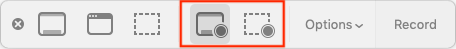 The fourth and fifth buttons are for creating screen recordings, and they’re similar to the screen capture choices. When you select one of them, the contents of the Options menu change, and the Capture button changes to Record. The movie will always be a QuickTime movie using the H.264 codec.