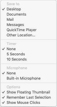 You can record yourself speaking while you make a movie of what’s happening on the screen. To do that, open the Options menu and choose Built-in Microphone. Another special movie recording option is Show Mouse Clicks, which puts a dark circle around the pointer in the recording whenever you click.