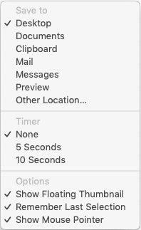 There’s also an Options menu on the control bar. Click it to choose which folder or app should receive the screenshot and if you need a 5- or 10-second timer to get the screen looking right first. You can also choose to show a floating thumbnail of the screenshot in the lower-right corner of the screen for quick markup or trashing, remember the size and location of the selection rectangle, and show the pointer in the screenshot.